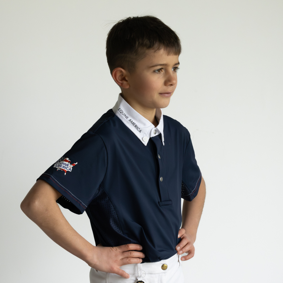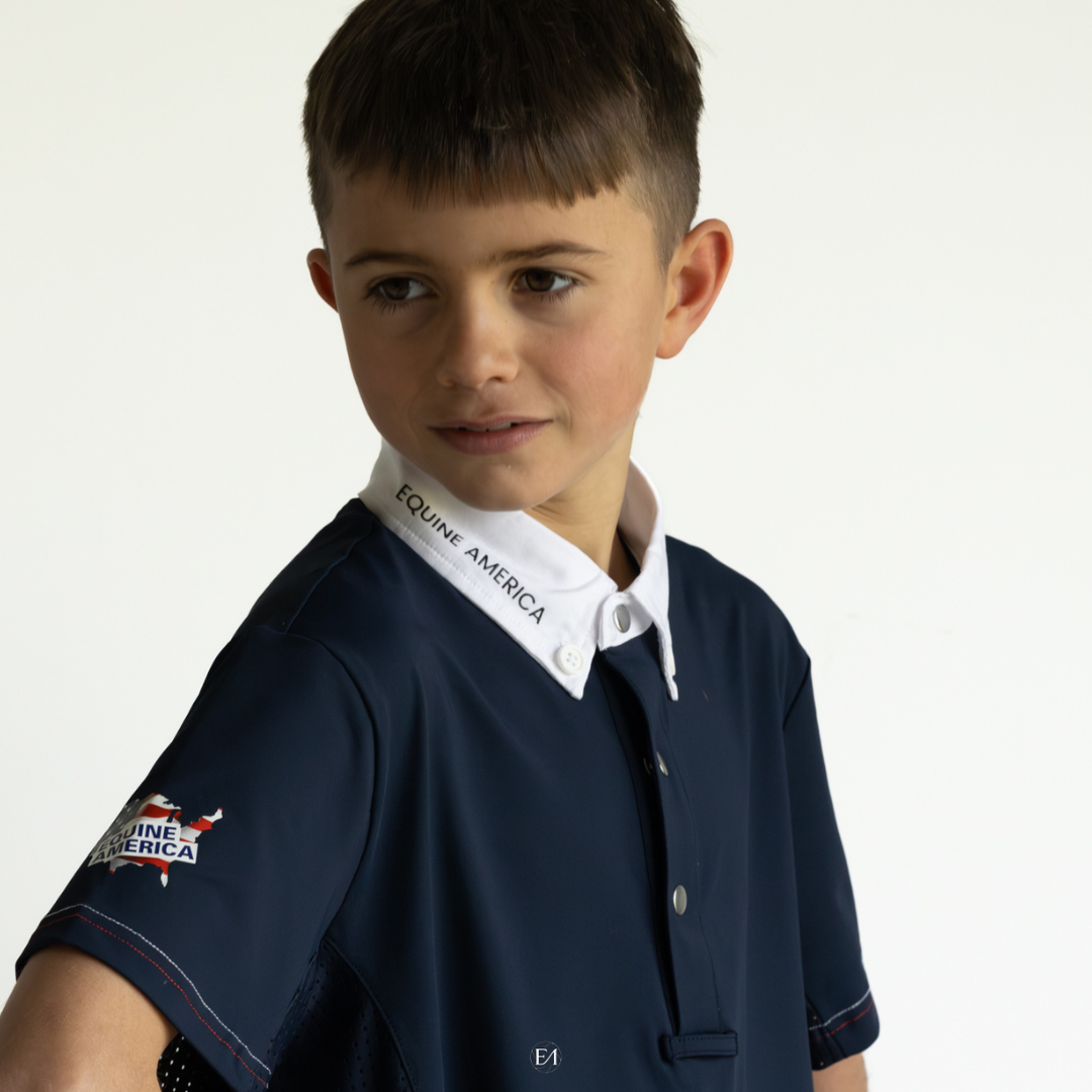 The Equine America competition polo shirt has a soft elastic and stretchable fabric that helps to fit and adapt perfectly to body, with a water repellent treatment on top that helps to repel some rain drops if it starts to rain while riding. Please be advised that the water repellent treatment will start to disappear after time and several washings. Mesh fabric at sides to easy transpiration.