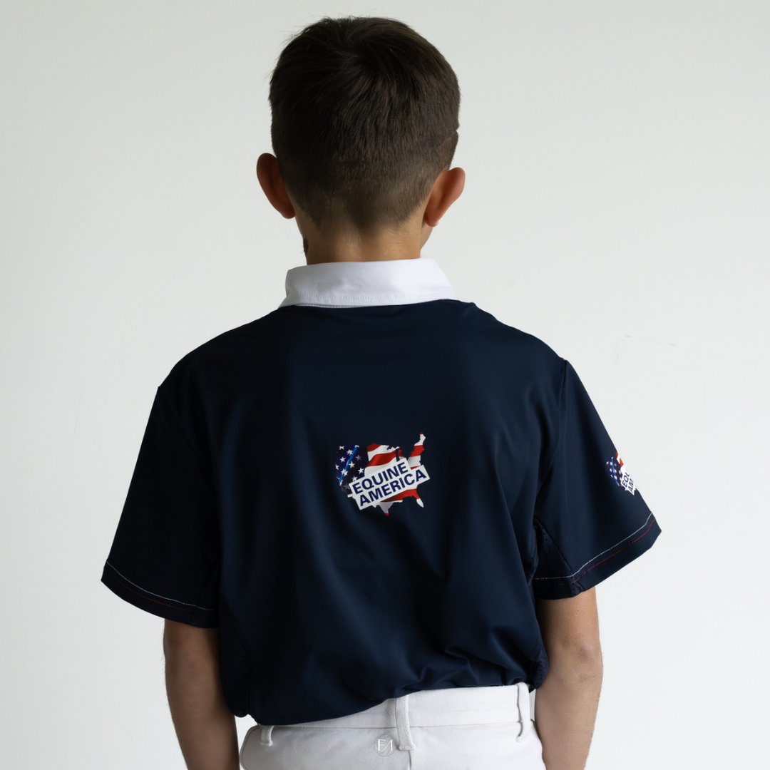 The mens competition shirt features the Equine America logo on the sleeve and on the back, with the rubber Equine America text on the button down collar. There is a tie loop to keep you looking smart!